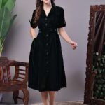 Women’s Black Velvet Solid Printed Shirt Midi Dress with Belt