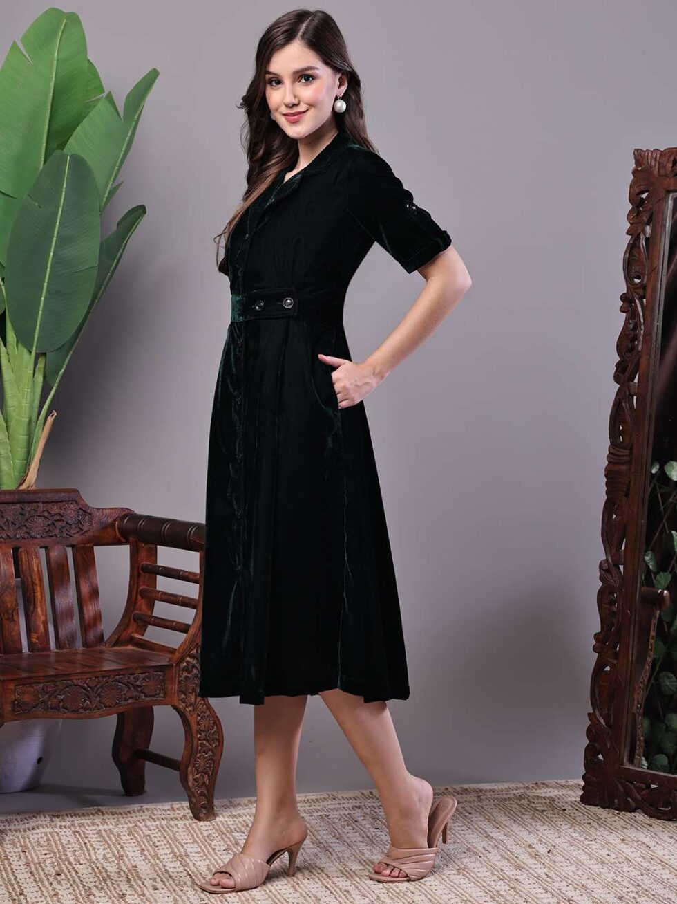 Women’s Black Velvet Solid Printed Shirt Midi Dress with Belt