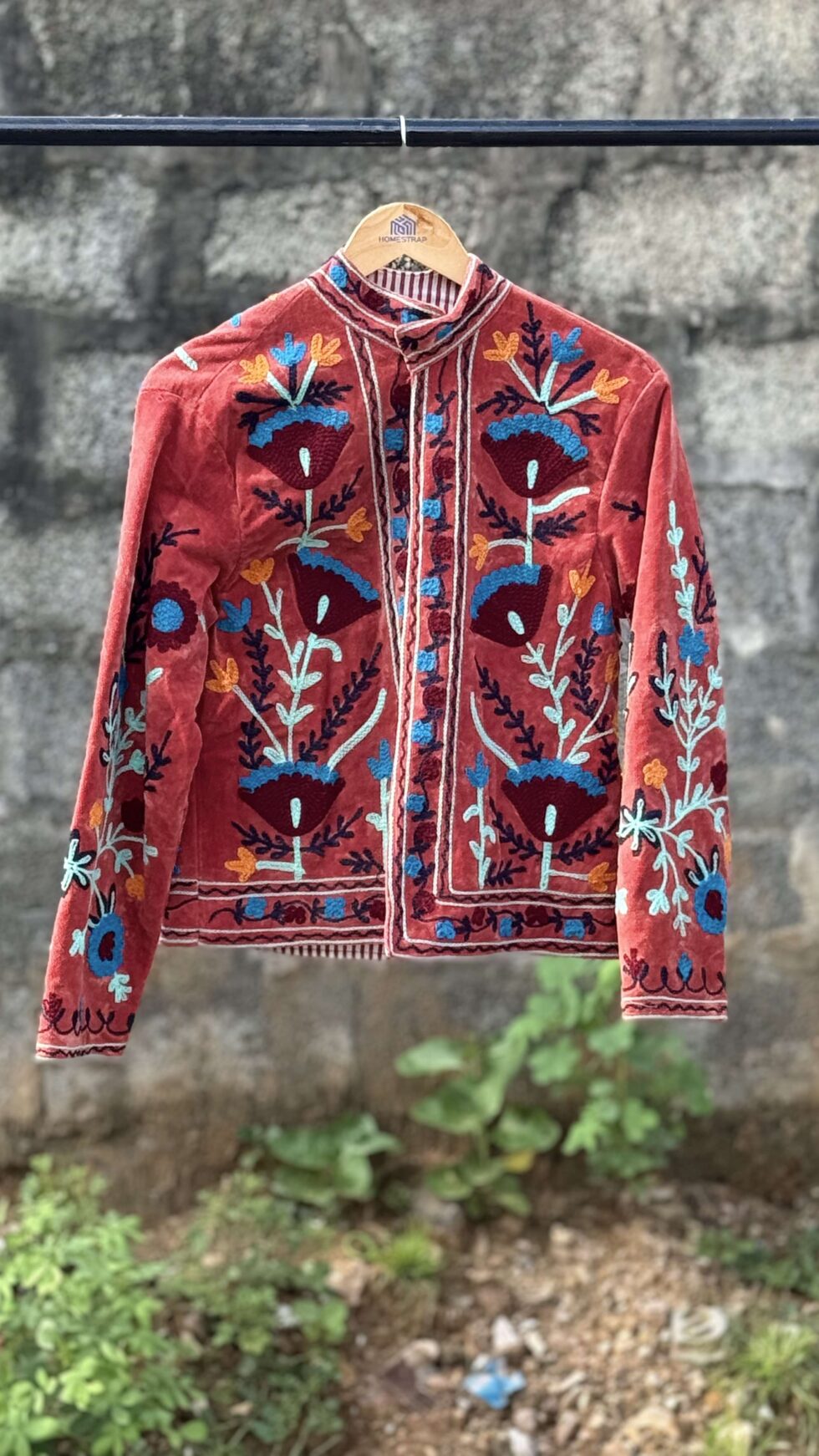 Luxurious velvet jacket featuring intricate Suzani embroidery. Perfect blend of elegance and tradition โ€” ideal for festive and ethnic occasions.